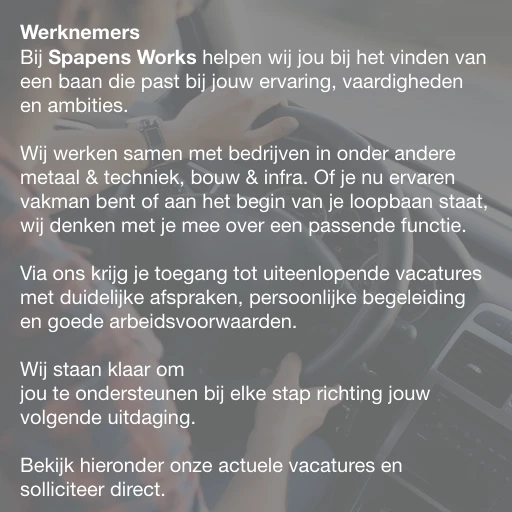 Bij Spapens Works kun je zowel als ZZP'er als in loondienst werken. We bieden flexibiliteit, goede voorwaarden en uitdagende projecten, ongeacht je contractvorm, zodat je altijd kunt groeien.