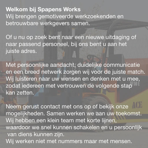 Bij Spapens zijn we een klein team met korte lijnen, waardoor we snel kunnen schakelen. Je hebt bij ons de mogelijkheid om je te blijven ontwikkelen en samen te groeien, ondersteund door goede secundaire arbeidsvoorwaarden.